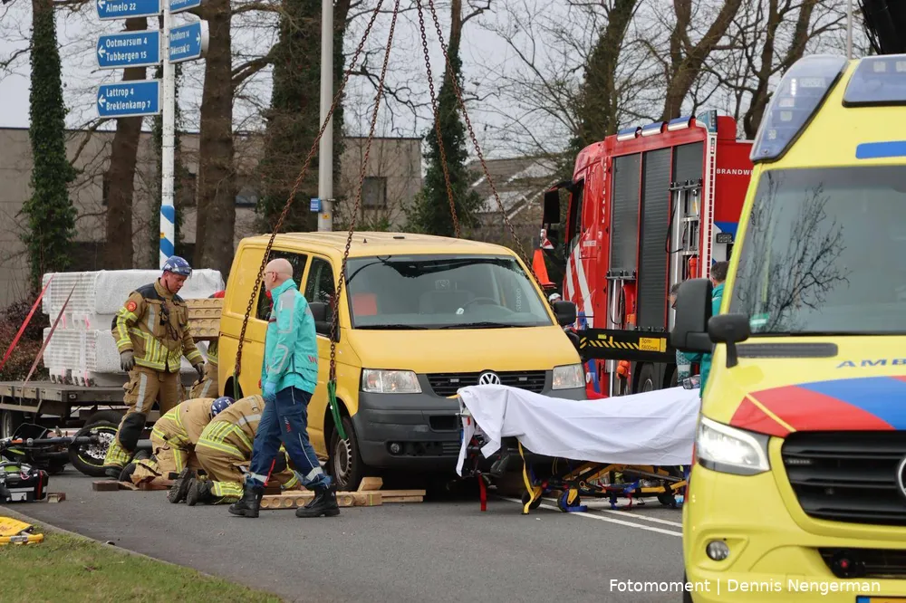 Dinsdagmiddag rond 13.20 uur is een vrouw, die op een brommer reed, onder een bestelbus gekomen aan de Ootmarsumsestraat in Tilligte.