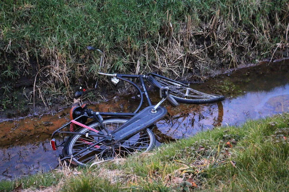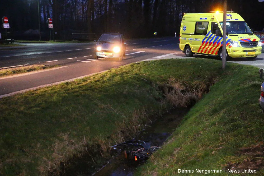 De fiets is door de klap in de sloot beland. De fietsster is met onbekende verwondingen overgebracht naar het ziekenhuis.