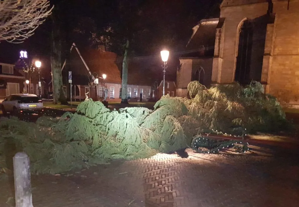 De kerstboom lag dwars op het plein en duidelijk was dat dit met opzet is gebeurd. Naast de kerstboom lag een handzaag.