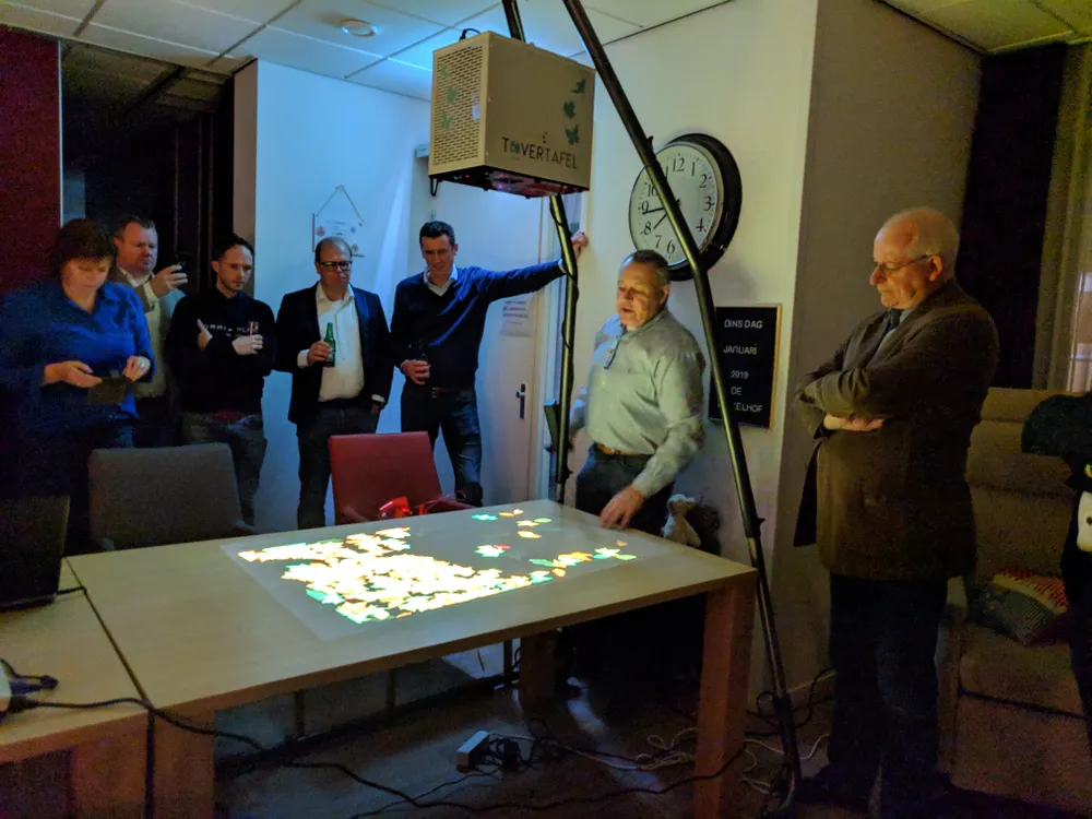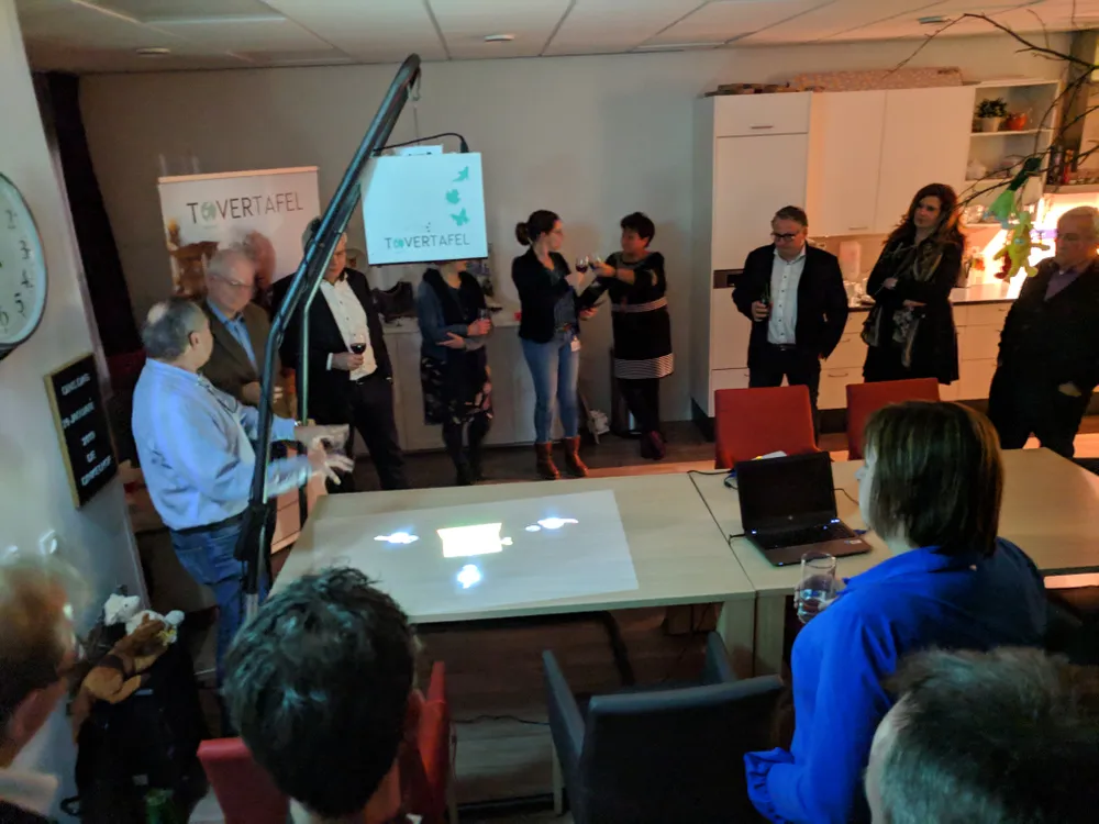 Onder het genot van een hapje en een drankje werd door Eric Huizer een demonstratie en nadere uitleg gegeven over de mogelijkheden van de tafels, die - in het geval van de Dr. Eekmanhof - gebruikt zal worden door dementerende ouderen. Zij kunnen hierop interactieve spelletjes spelen, die speciaal op deze bijzondere doelgroep toegesneden zijn.