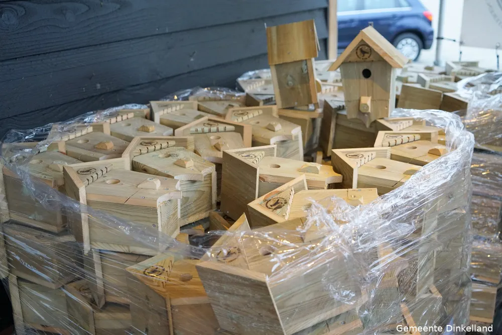 Het is vandaag een drukte van belang bij Erve Meinders in Tilligte, waar gratis nestkastjes op te halen zijn.