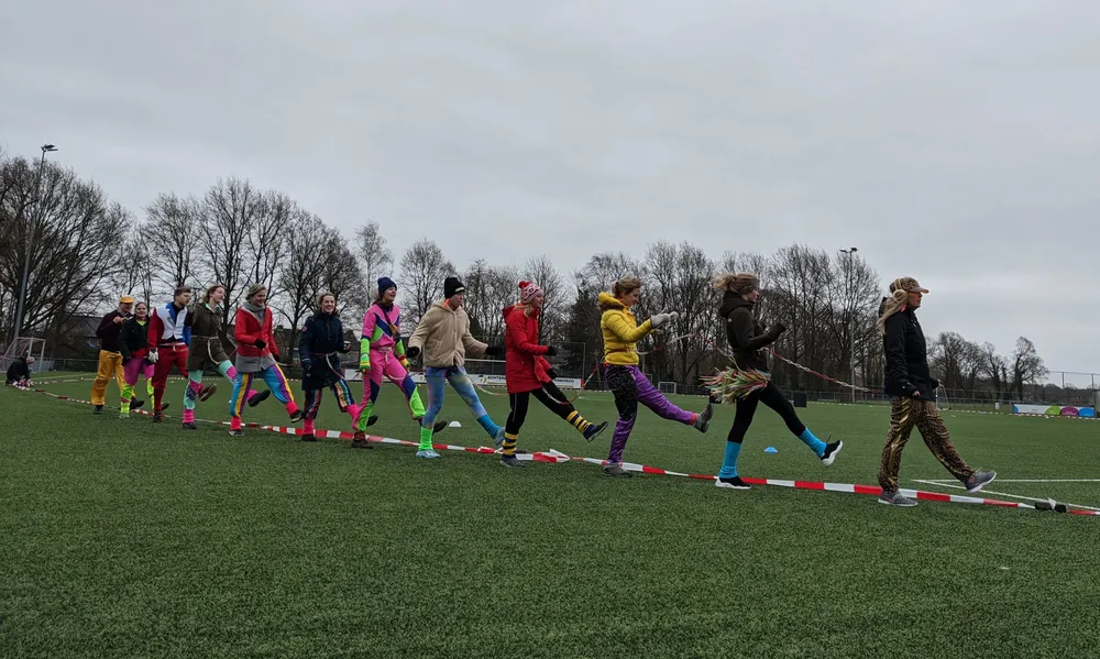 Vanmorgen om zeven uur begon een groep van meer dan 10 carnavalisten aan de uitdaging: achter elkaar in een polonaise lopen en ondertussen conga dansen. Tegen weer en wind, op een kunstgrasveld van voetbalclub RSC.