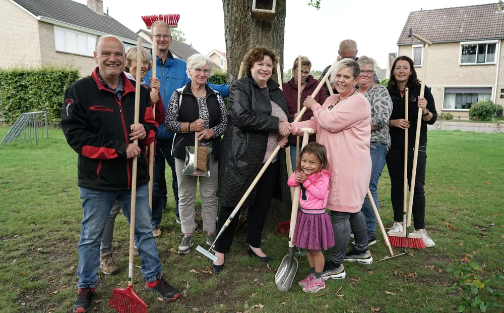 Al vroeg op de zaterdagochtend is er volop bedrijvigheid op het veldje aan de Roerdomp in Denekamp. Twee jaar geleden startte de buurt samen met adviesbureau LaSiSa en de gemeente Dinkelland een project om de sociale contacten te versterken en de buurt een opknapbeurt te geven. Inmiddels is de buurt een ontmoetingsplek, hondenspeelveld en nieuwe beplanting rijker. "Wat in deze wijk gebeurt, is heel bijzonder", vertelt wethouder Duursma. "Er speelden een aantal sociale problemen, die mede dankzij dit project zijn verholpen. Vandaag sluiten we het project symbolisch af door de buurt tuingereedschap te overhandigen, zodat zij zelf het onderhoud kunnen plegen."