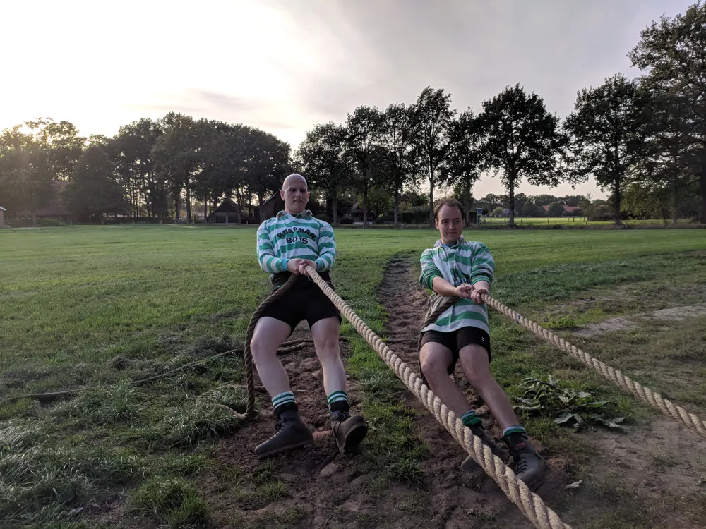 “Het lijkt misschien een simpel spelletje, maar deze sport vereist veel spierkracht, techniek en tactiek", vertelt de andere thuisblijver Koen Leeferink (30) passioneel. Vijftien jaar geleden hing hij z'n voetbalschoenen aan de wilgen na een periode van knieproblemen. "Bij het touwtrekken maak je geen plotse draaibewegingen met je been, dus nu is er niks bij me aan de hand. In principe gebruik je alleen duw- en trekspieren."